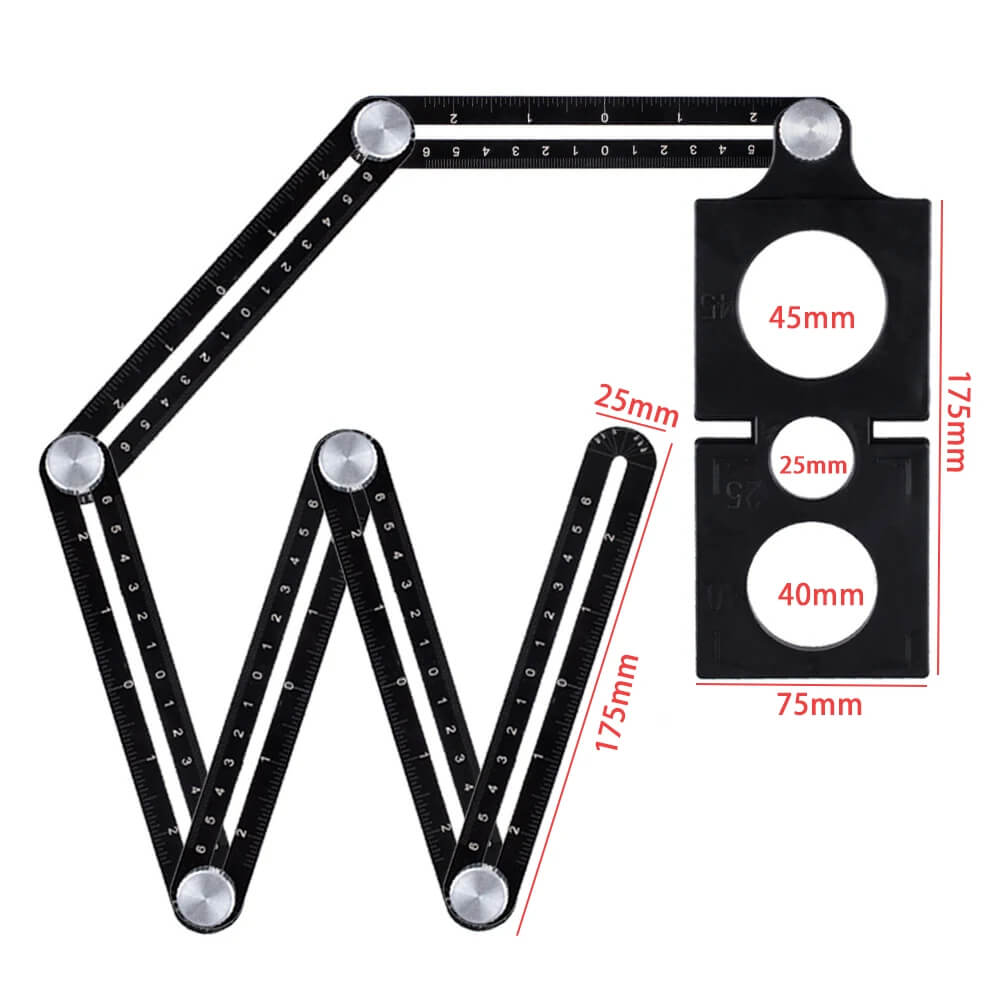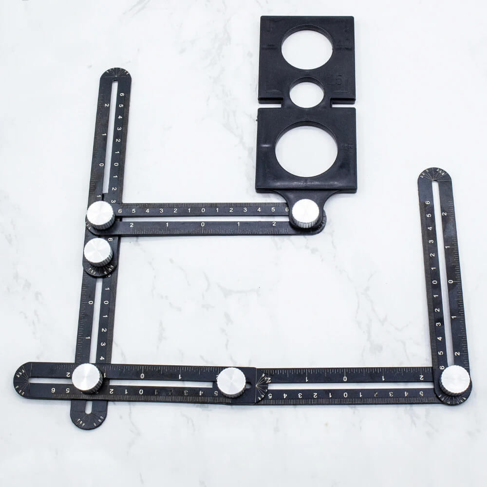 La plantilla de seis brazos con perillas metálicas se ajusta al ángulo deseado y se bloquea. Úsala como guía para marcar y cortar tu pieza de trabajo sin mediciones repetitivas.